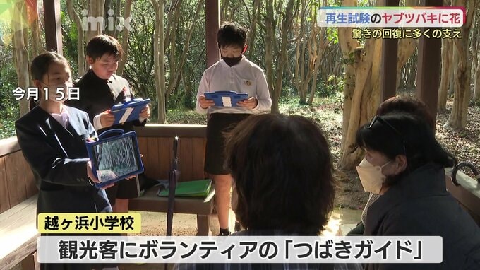 群生林のヤブツバキは、萩市の冬の観光にとって欠かせない存在です。笠山の近くにある越ヶ浜小学校では、地元の観光資源をもっと知ってもらおうと観光客にボランティアの「つばきガイド」を行いました。草野さんや地域の人たちに群生林のことなどを教えてもらい、保護者の前などで4回ガイドの練習をしてきました。