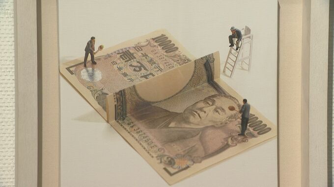 テニスコートに見立てた1万円札と、日本人の奥ゆかしい?ちょっと過剰なやりとりを楽しく表現しています。