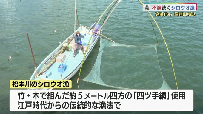 松本川のシロウオ漁は、竹や木で組んだおよそ5メートル四方の「四ツ手網」ですくい取る、江戸時代からの伝統的な漁法で行われています。しかし網を入れてもシロウオが入らず、空振りというのも目立ちました。40年ほど前にはおよそ3000キロの漁獲量がありましたが、最近10年間の平均漁獲量は139キロ。特にこの3年は、歴史的な不漁になっています。