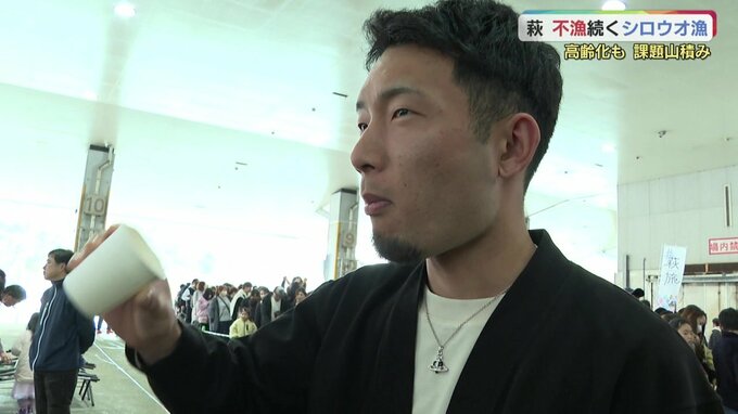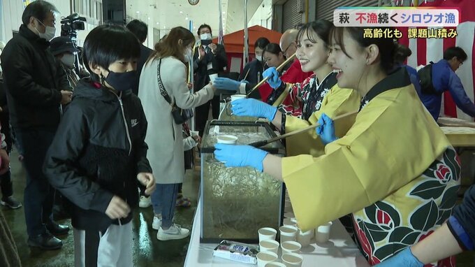 3月17日、シロウオ漁が最盛期を迎えるのに合わせて「萩・しろ魚まつり」が開かれました。新型コロナや去年の不漁の影響で、5年ぶりの開催です。酢じょうゆの入った紙コップに生きたシロウオを入れていきます。萩伝統の食文化、おどり食いの無料サービスです。7.2キロほどが用意され、訪れた人は早春の味を楽しんでいました。