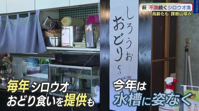 道の駅「萩しーまーと」にある飲食店です。毎年、春の味覚としてシロウオのおどり食いを提供していますが、今年も入荷が少なく、水槽にシロウオの姿はありませんでした。おどり食いは家族連れなどに人気で、入荷の問い合わせなども多いということです。