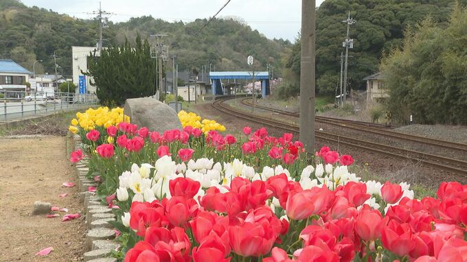 線路のすぐそばで色とりどりの花が列車を迎えます。