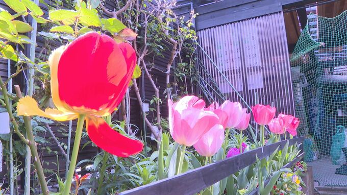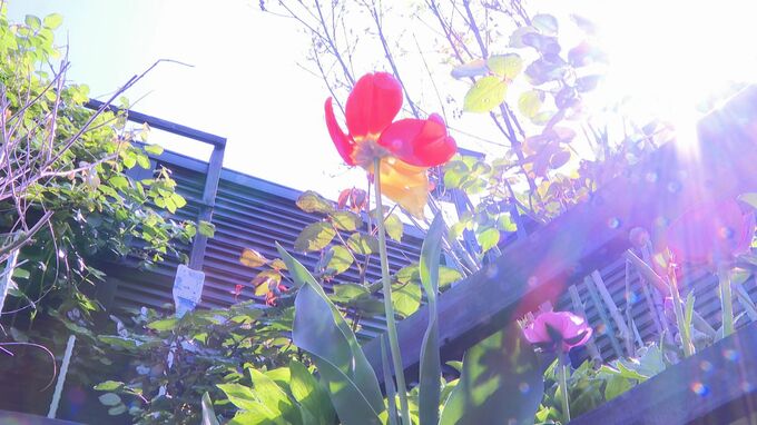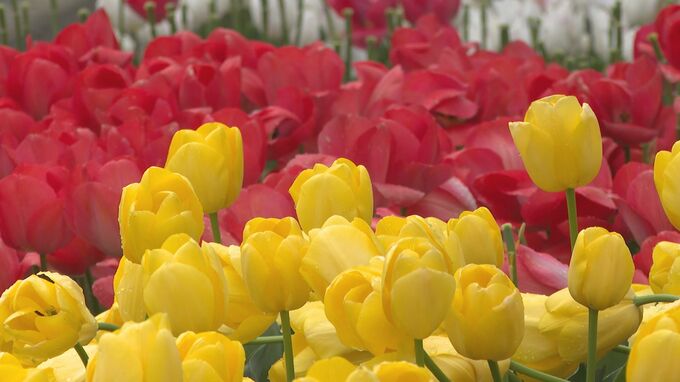 「ぱっと見た感じは、赤いチューリップなんですが…このように見てみると赤と黄色、2色のチューリップになっています」