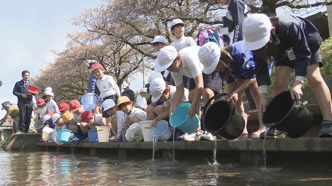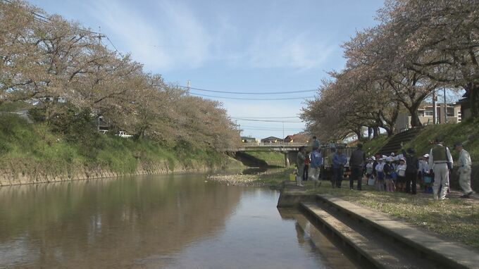 桜並木で知られる市役所そばの厚狭川に大嶺小学校の3年生の児童およそ40人が集まり、バケツの中に体長5センチほどに育ったアユの稚魚を入れてもらいました。