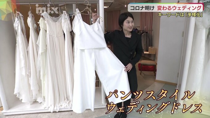 変化はこれだけにとどまりません。パンツスタイルのウェディングドレスです。日本では、まだ普及をしているとは言えませんが海外のドレスのコレクションではよく見られるようになっているといいます。