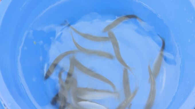 バケツのなかに体長10センチほどに育ったアユの稚魚を入れてもらいます。