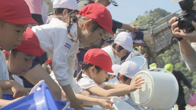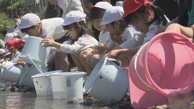 室の木幼稚園の園児が声をかけながらアユの稚魚を川に送り出しました。
