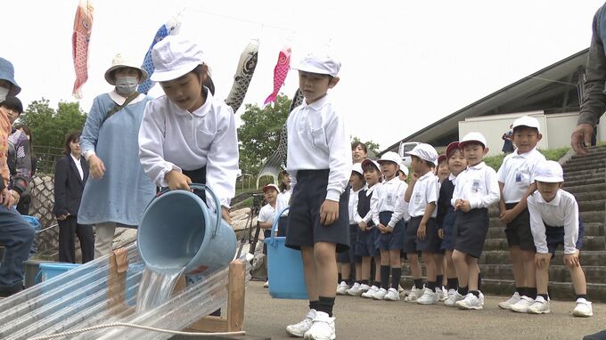 子どもたちは、椹野川漁協が用意した大きさ8センチほどのアユの稚魚をバケツに入れてもらい、「大きくなあれ」と声をかけながら放流しました。