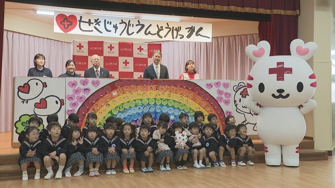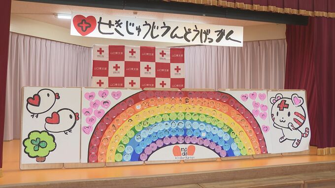 日本赤十字社が活動への理解を呼びかける「赤十字運動月間」を盛り上げようと作られたもので、園児の似顔絵をつないで、虹がデザインされました。