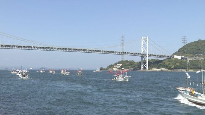 赤ののぼりの平家と白ののぼりの源氏に分かれ、およそ30隻が関門海峡をパレードしました。