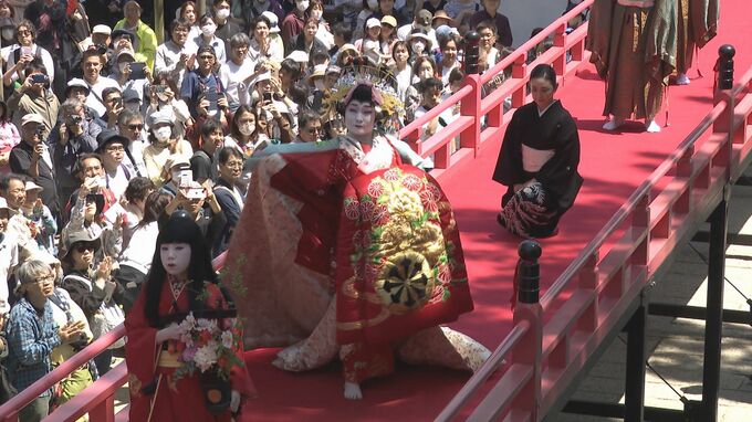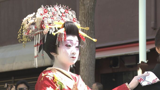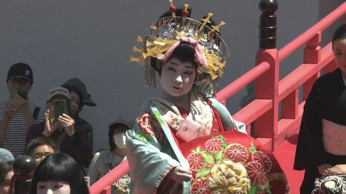 境内を埋め尽くした見物客を前に、八の字を描きながら優雅に歩く「外八文字」を披露しました。