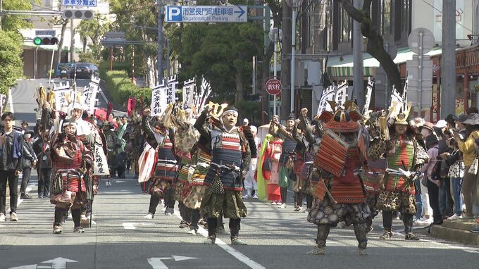 源平武者行列も行われおよそ100人がよろいを身にまとい、源氏と平家の武士に扮し、市内をパレードしました。