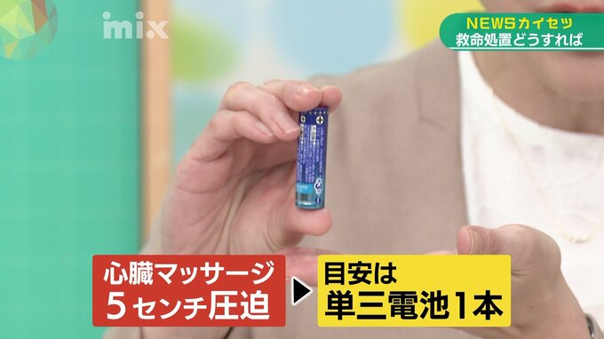 心臓マッサージの圧迫はおよそ5センチ、単三電池1本分が目安ですが、人間の体をこれほど圧迫することはありませんし、怖いですよね。