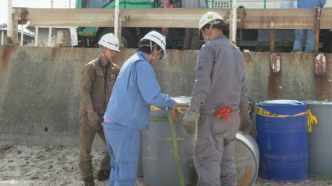 撤去作業では、漂着物が詰められたタンクなどをひとつひとつつり上げてトラックに積み込みました。