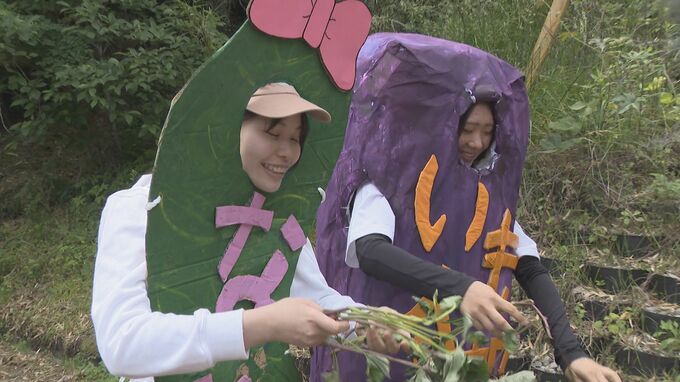 岩国市で幼稚園児と短大生がサツマイモの苗を植え付けました。