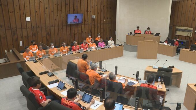 来月2日の清水エスパルス戦は、山陽小野田市のホームタウンデーです。山陽小野田市では市庁舎玄関口に全選手ののぼり旗を掲げたり、職員がユニフォームを着たりするなど、機運の盛り上げを図っています。きょう開かれた臨時市議会でも、全ての議員らがユニフォームやTシャツを着て臨みました。