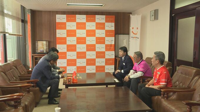 山口県山陽小野田市の藤田剛二市長を訪ねたのはレノファ山口の渡部博文社長とトップパートナー企業、不二輸送機工業の米中郁雄社長です。