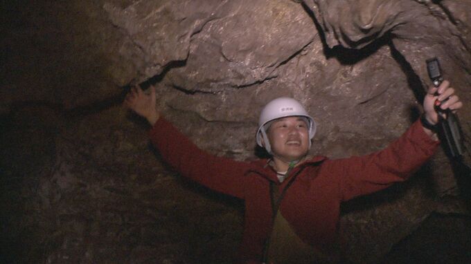 ヘルメット姿で懐中電灯を手に、洞窟がかつて海だったことを示すさんごなどの化石を探し出すなど、冒険家さながらの体験を楽しんでいました。