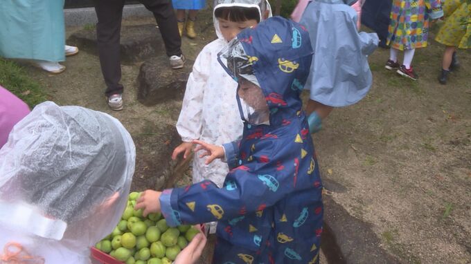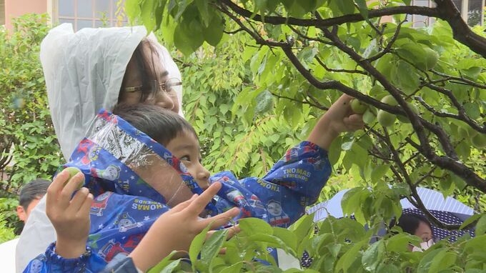防府天満宮の「梅ちぎり」は初夏の恒例行事で、市内の園児28人が参加しました。あいにくの雨でしたが園児らはたくさんの梅の実を収穫していました。