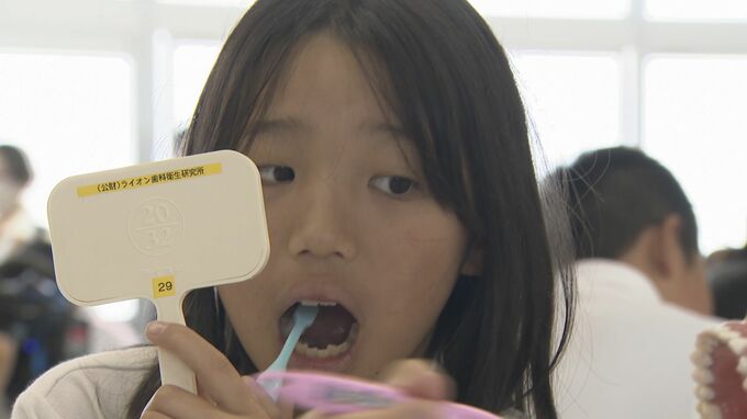 児童は歯ブラシを使って、奥歯を磨く時の角度やみがく回数などに気をつけながら、正しい磨き方を練習しました。この大会は今月4日から始まった歯と口の健康週間に合わせて、日本学校歯科医会やライオンなどが行ったものです。先週の特別授業とあわせて、歯を大切にする意識を持ってもらうことがねらいです。