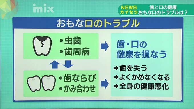 口のトラブルというと代表的なものに虫歯、歯周病が挙げられますが、こうした原因で歯や口の健康を損なうと歯を失う→よくかめなくなる→全身の健康状態が悪化する、ということになってしまいます。