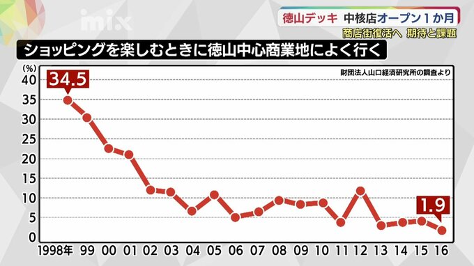 地元の人は、ショッピングを楽しむときにどこに出かけるのか。山口経済研究所がアンケート調査をしています。1998年は徳山中心商業地が34.5パーセントで1位でした。しかし、その後は周辺の大型商業施設に客足を奪われ、2016年には実に1.9パーセントにまで落ち込みました。