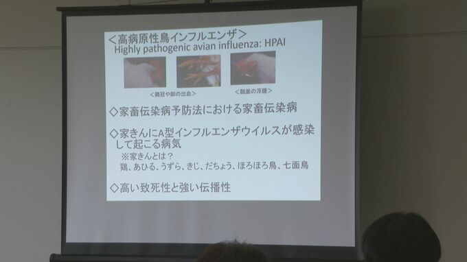 職員らは鳥インフルエンザの特徴や対応にあたるときの法令などを学んでいきました。県内ではこれまでに4回発生していて、現場で対応にあたる職員は精神的、体力的に過酷な環境にあるといいます。