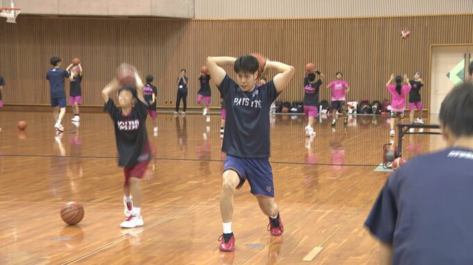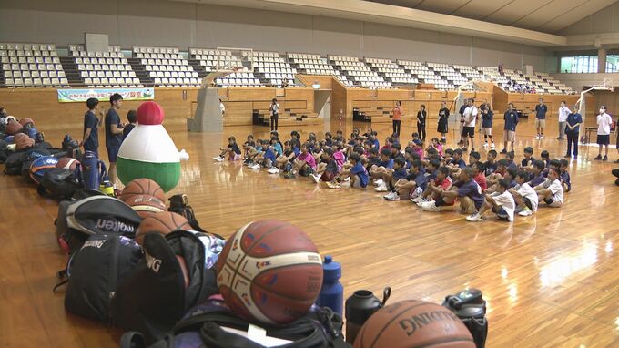 「やまぐち米パワー全開スポーツ教室」は米の消費拡大を目指して県おこめ流通協議会が開いているもので小学生およそ60人が参加してバスケットボール教室が開かれました。
