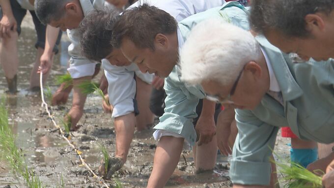 坂田さんら代表者が26.7アールの水田に「きぬむすめ」の苗をひと株ずつ手で植えていきました。