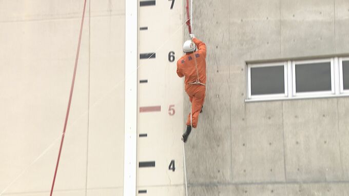 消防士が日々の訓練の成果を確かめます。垂直のはしごを15メートル登る、はしご登はんや、マンホールの下などを想定して要救助者を救出する引揚救助など、6種目で、確実さやスピードを競いました。