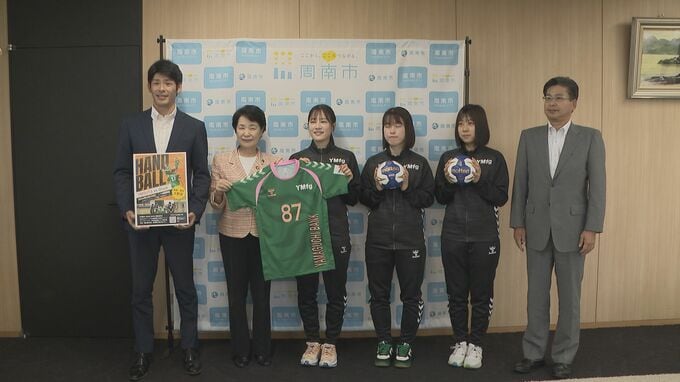 26日に周南市の藤井律子市長を訪ねたのは、女子ハンドボールチーム・山口銀行YMGUTSの岡田あずさキャプテンら5人です。今月29日にゼオンアリーナ周南で、愛媛県のチームを迎えての強化試合を控える中、このホームゲームをはずみにして「日本一を目指す」と意気込みを語りました。