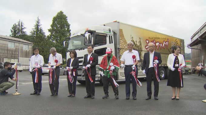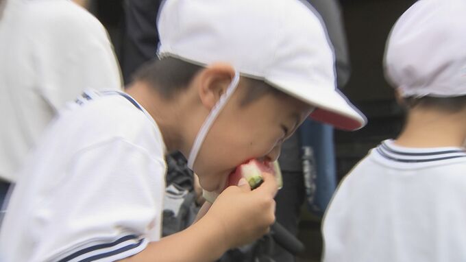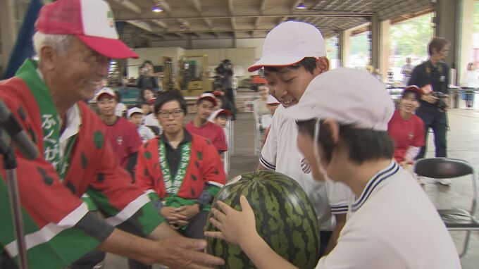福賀すいかは、スイカの栽培に適した昼夜の寒暖差が大きい気候をいかして、阿武町福賀地区の6人の農家が育てています。初出荷式には、福賀小学校の児童8人も出席しました。