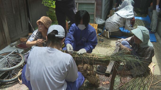 国内でも珍しいとされる、石と土を積み上げて作られた塀、「練塀」。その横で進められていたのは、ことしの神舞で神棚の周りに置かれる「苫編み」を作る作業です。