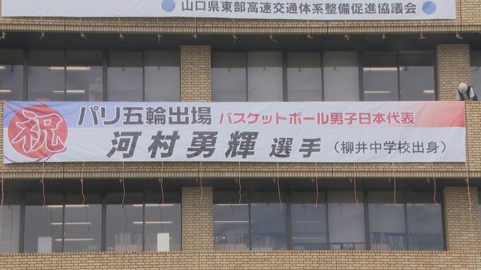 その河村選手がパリオリンピックの日本代表に選ばれたのを受けて、出場を祝う横断幕が9日、柳井市役所に掲げられました。