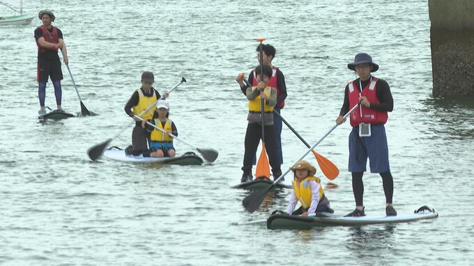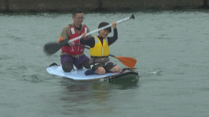 きょうは、水の安全について講習を受けた22組の親子などが、専用のボードの上に立ってパドルをこいで水面を進む「SUP」などを体験しました。