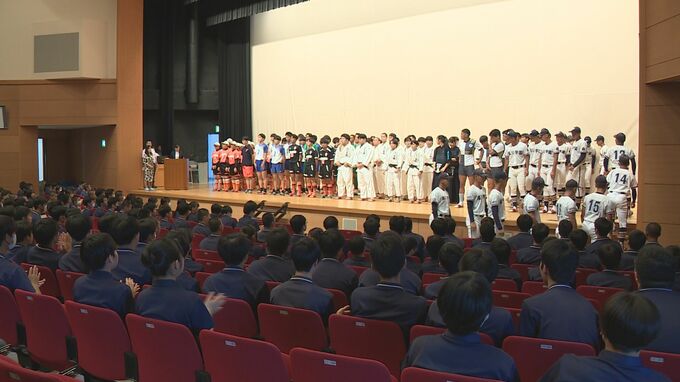 山口県防府市の高川学園高校で19日、インターハイなどに出場する選手に向けた壮行会が開かれました。インターハイに出場する男子サッカー、男子バレー、女子ソフトボールなどの選手と高校野球山口県大会に出場している野球部の選手が拍手で迎えられながら入場しました。