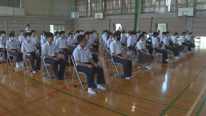 山口県阿武町の阿武中学校では19日、生徒が体育館にパイプいすを並べて終業式が行われました。なぜでしょうか。