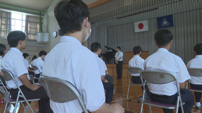生徒たちはいすに座って校長の話を真剣に聞いています。阿武中学校では今年4月、矢田部敏夫校長が着任して、いわゆる体育座りを廃止しました。学校では、体育座りの姿勢が体に負担がかかるため集中力が落ちるうえ、生徒を床に座らせることにも抵抗があるということから「脱・体育座り」となりました。