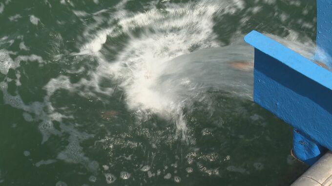 船の廃材を使った台の先から稚魚が次々と海に放たれていきました。