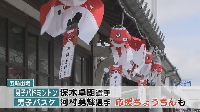 出場する市内出身の男子バドミントン・保木卓朗選手と、男子バスケ・河村勇輝選手を応援する金魚ちょうちんも飾られています。