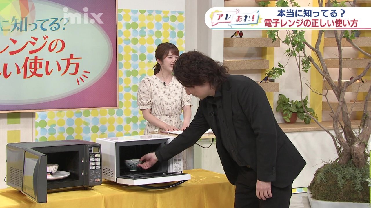 「早速ですが、今日はスタジオに電子レンジを2台用意しました。ゲストの小川さん、こちらの2つの電子レンジにいつも温めている時のようにお皿を置いてみてください」