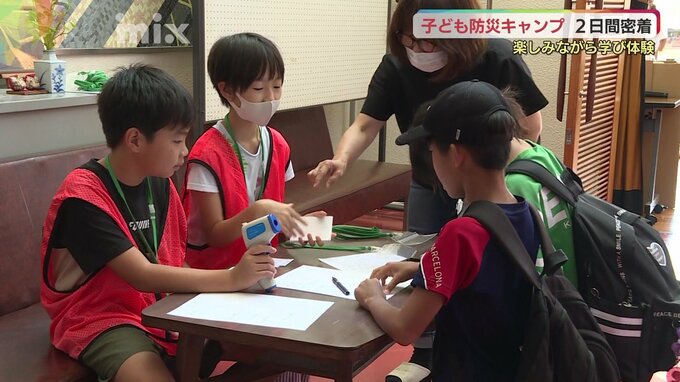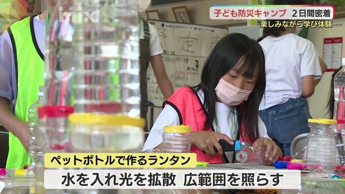場所は避難所に指定されている松崎公民館です。キャンプには松崎小学校の13人が参加しました。まずはワークショップ。3つの班に分かれて、新聞スリッパやペットボトルランタン作り、ハザードマップの確認を行いました。