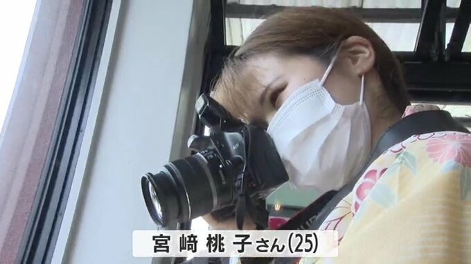 着物姿でカメラを構える女性。こちらが長門湯本温泉の旅館で働く宮﨑桃子さんです。