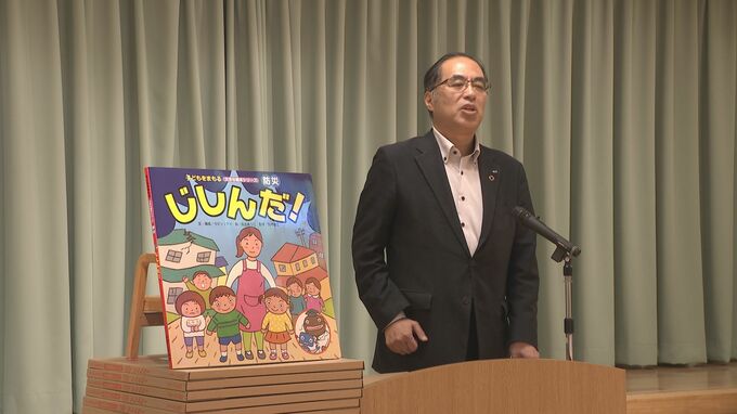 防災絵本「防災じしんだ!」を贈ったのは、山口県内に事業所を置く住宅メーカーでつくる「やまぐちハウスメーカー協会」です。受領式で三谷信一会長が「災害について一緒に勉強していきましょう」と絵本を手渡しました。
