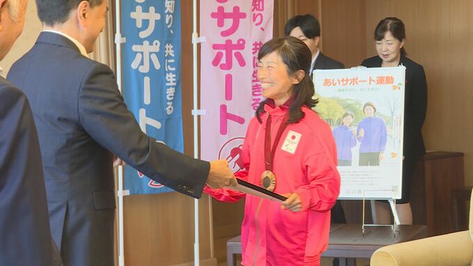 山口県の村岡知事は「これからも走り続けて、お話や成果の報告を聞かせてもらいたい」と述べ県スポーツ特別褒賞を贈りました。