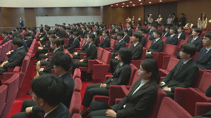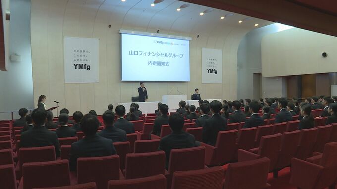 山口県下関市で行われた山口フィナンシャルグループの内定式には、来年4月に入社予定の大学生など102人が出席。