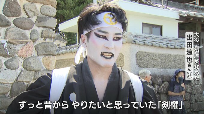 最終日の18日。大分からの一行を送り出す日です。神職らが乗った船とともに、櫂伝馬は海へと、こぎ出しました。出船神事です。入船神事と同じく、涼也さんの姿があります。力強く披露する最後の舞。子どもの頃から憧れ続けた伝統の大役を全うしました。神事を終えた涼也さんにねぎらいの言葉がかけられます。
