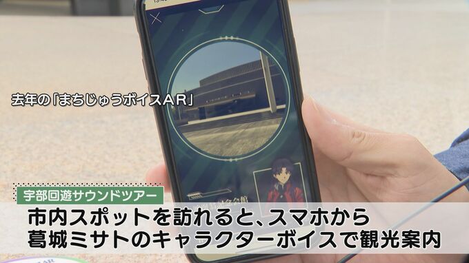 「宇部回遊サウンドツアー」では、市内の特定のスポットを訪れると、スマホから葛城ミサトのキャラクターボイスの観光案内や音楽が聞こえます。