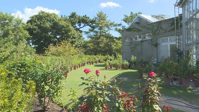 宇部市ときわ公園内の植物館横の庭に、バラの鉢が並んでいます。あさって12日に始まる「秋のバラ展」で展示されるものです。