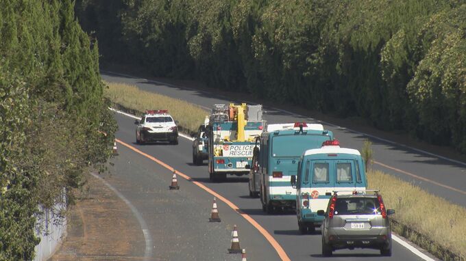 「宇部伊佐専用道路を警察車両が一列に並び通行していきます」